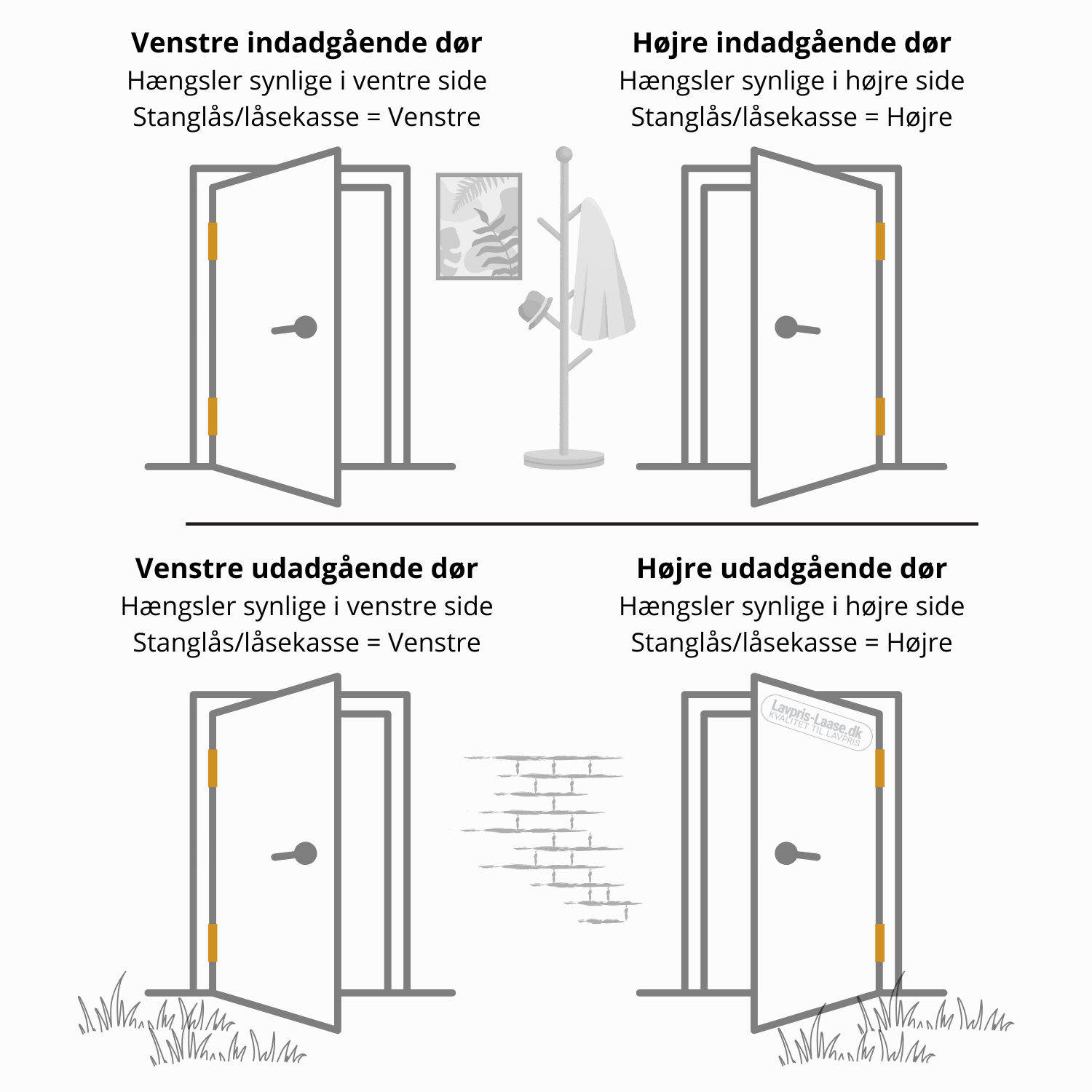 For at afgøre dørens hængselside skal du placere dig på den side, hvor hængslerne er synlige, når døren er lukket. Dette er typisk indersiden for indadgående døre og ydersiden for udadgående døre.
